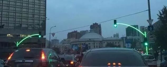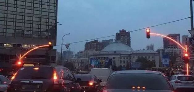 这是在欧洲国家乌克兰的街头, 新型红绿灯已经被推广使用, 这种红绿灯和传统红绿灯最大的区别就是同一路口的信号灯设置在道路两侧, 用来支撑的立柱也发出和信号灯一样颜色的光线, 提高了红绿灯的警示作用!