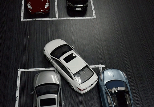 当确定车位可以停进去时,我们按照“非字型”车位的停车技巧:先将车辆位置“摆斜”,当车辆“摆斜”到驾驶员通过左后视镜可以看到车位左侧车辆的边角时,就可以开始倒车。