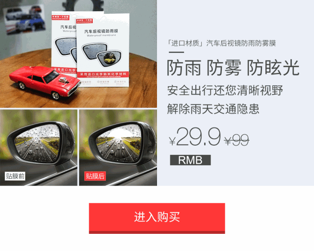 安装了这款“后视镜防雨雾膜”后,雨滴接触玻璃快速滑落,内含高分子活性物可有效防雾,视野更开阔清晰,行车更顺畅安全。