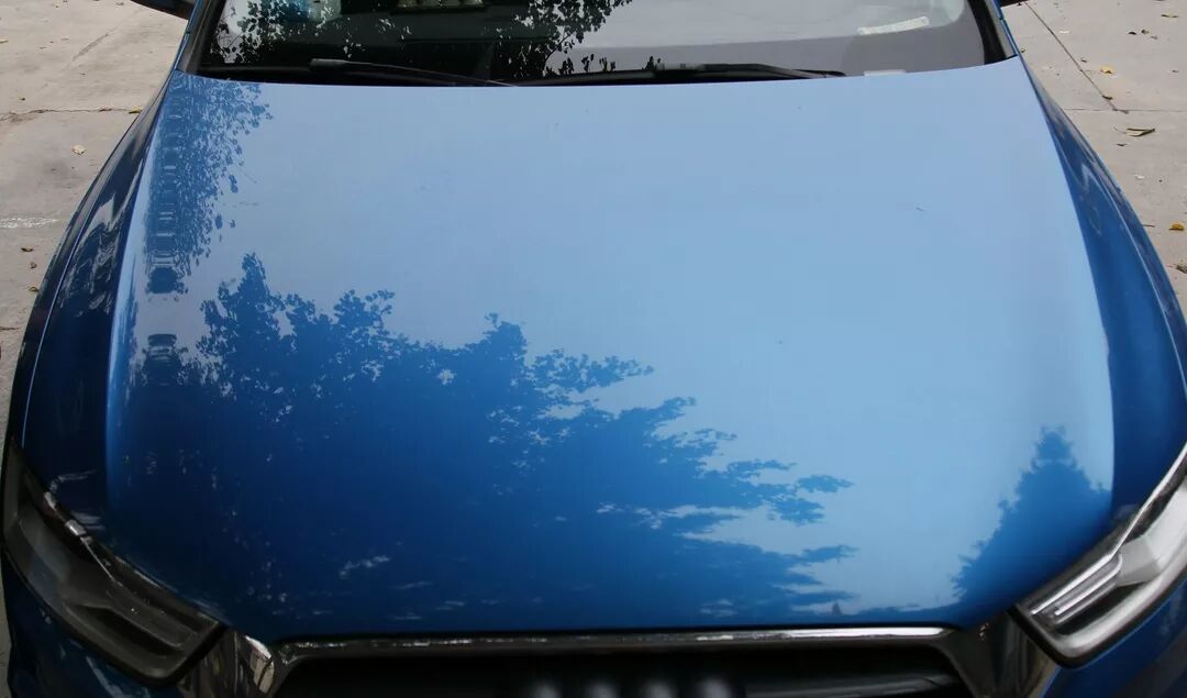 左边区域通过洁净处理后,车漆表面的灰尘完全去除且恢复亮丽光泽。